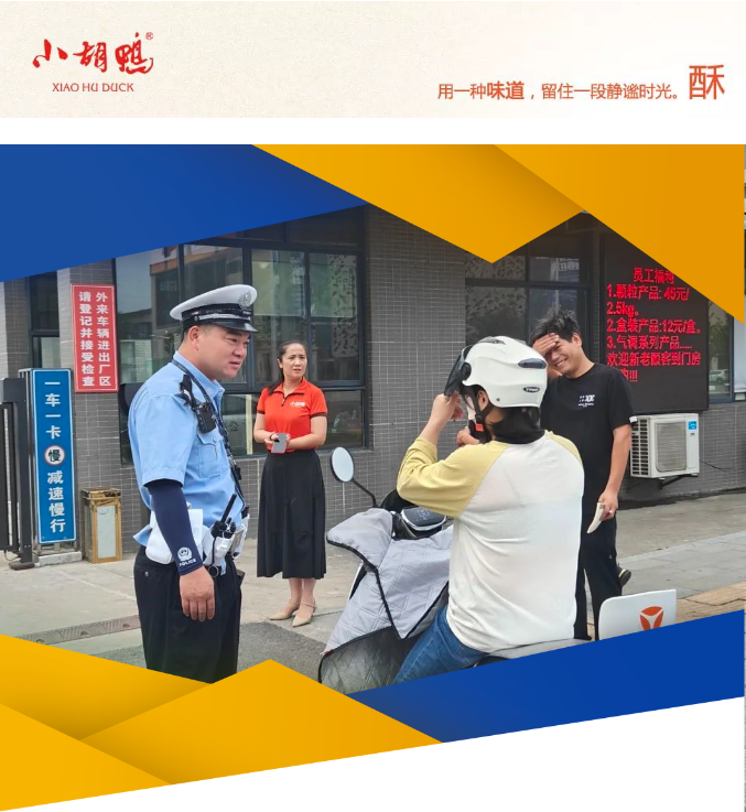为进一步加强和规范员工骑电动车上下班,有效杜绝骑行者不按规定穿戴安全头盔和反光背心、逆向骑行、无牌无证骑行、载人超员等交通违法乱象。9月3日,小胡鸭公司安委会及办公室联合荆州市公安局交通管理局二大队八中队到公司开展安全检查工作,为企业安全生产保驾护航。
